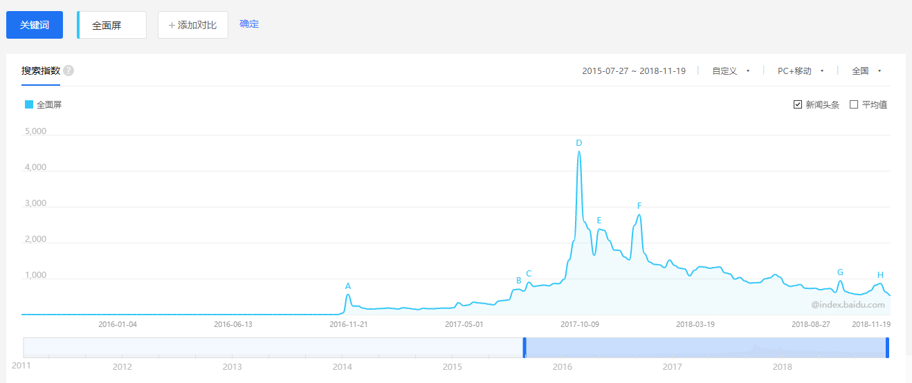 百度指数显示,关键词"全面屏"搜索指数最大值出现在2017年9月份,正值iPhone X发布。自那之后,刘海屏也变成全面屏手机最常见造型。